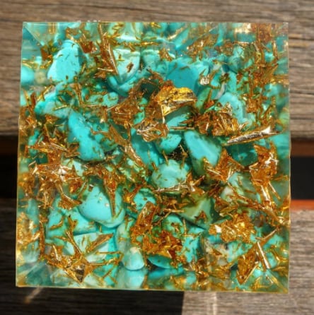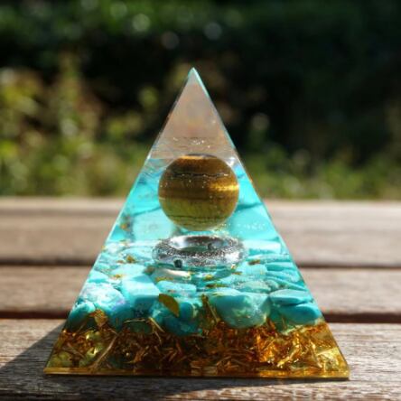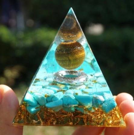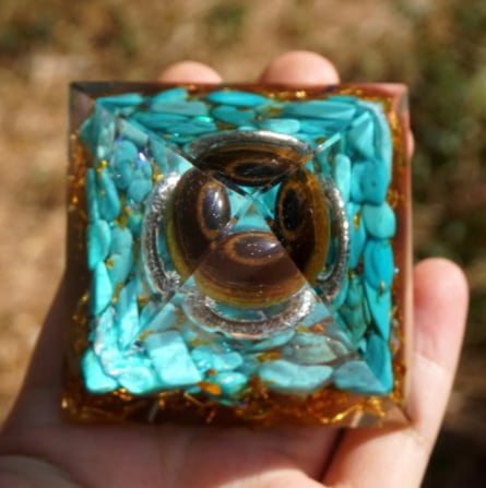 「ターコイズ」と「タイガーアイ」をふんだんに使った、本格的なピラミッド型オルゴナイトです。