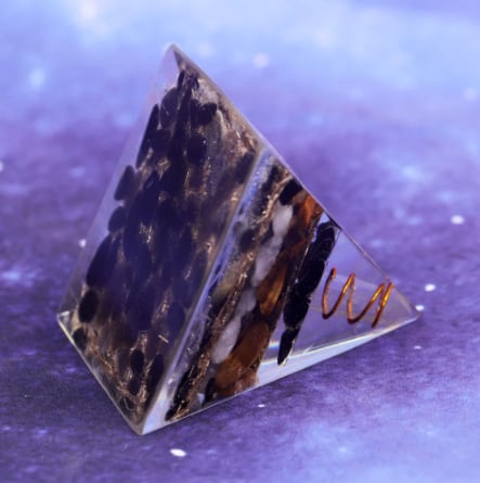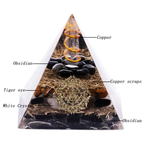 【オルゴンピラミッド】オルゴナイト 6cm 黒曜石+タイガーアイ ホワイトクリスタル 銅のコイル【チャクラ】