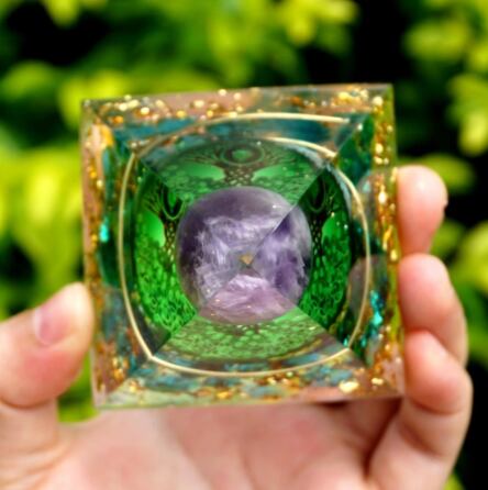 アメジストの球とブルークォーツ、樹脂とっ金箔で作った、ピラミッド型オルゴナイトです。