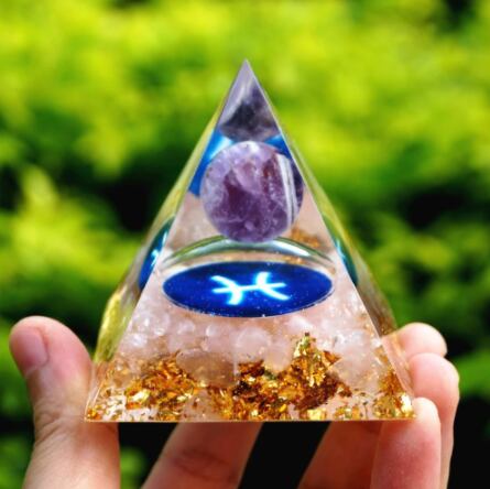 【オルゴナイト】うお座 ローズクォーツ+アメジスト球 ピラミッド型 星座マーク入り【6cm】